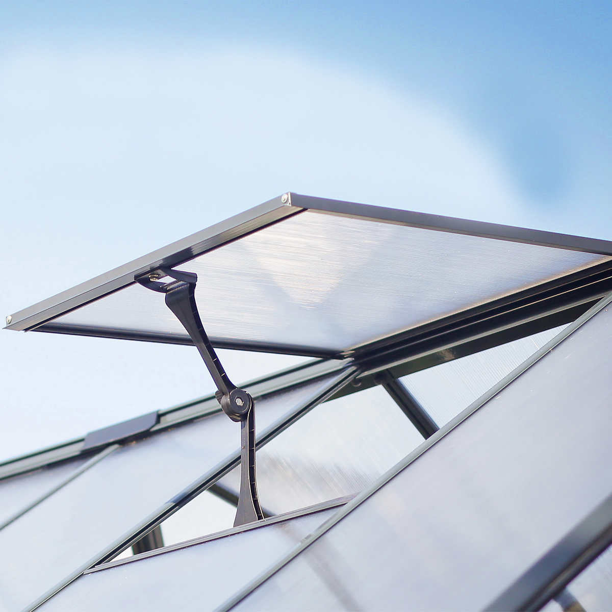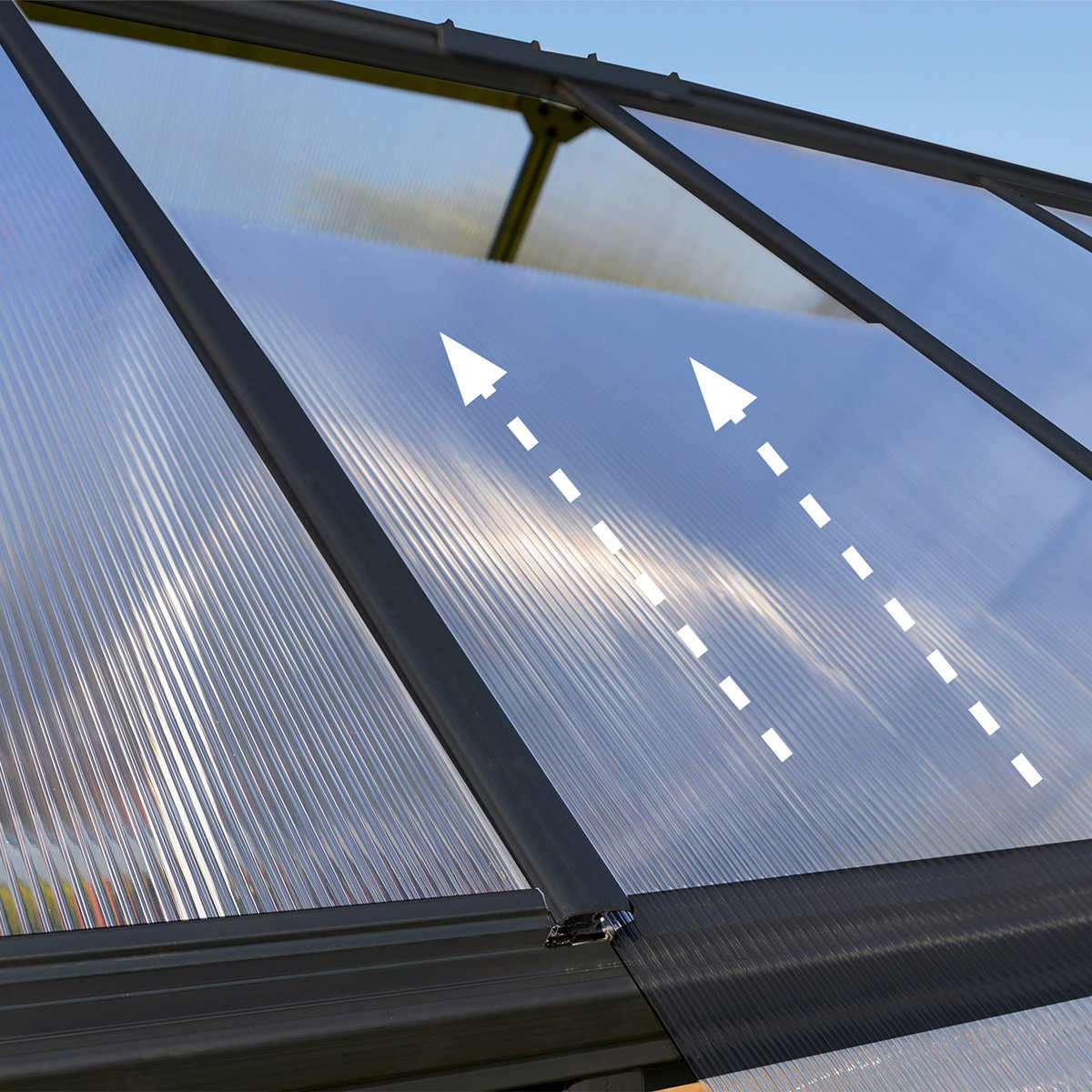 • Virtually unbreakable, twin-wall polycarbonate panels, provide over 70% light transmission