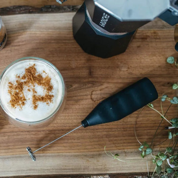 • Battery-powered milk frother with stainless steel whisk