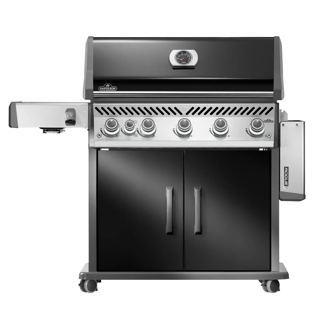 Napoleon’s Rogue® PRO 625 Natural Gas Grill with Infrared Side Burner delivers culinary perfection. Its sleek two-tone design combines black and stainless steel. The grill features precise temperature control with even heat distribution, high heat searing capability, cast-iron cooking grids, and instant ignition across five burners to elevate your grilling experience. Sear restaurant-style steaks on the integrated side sear station.
