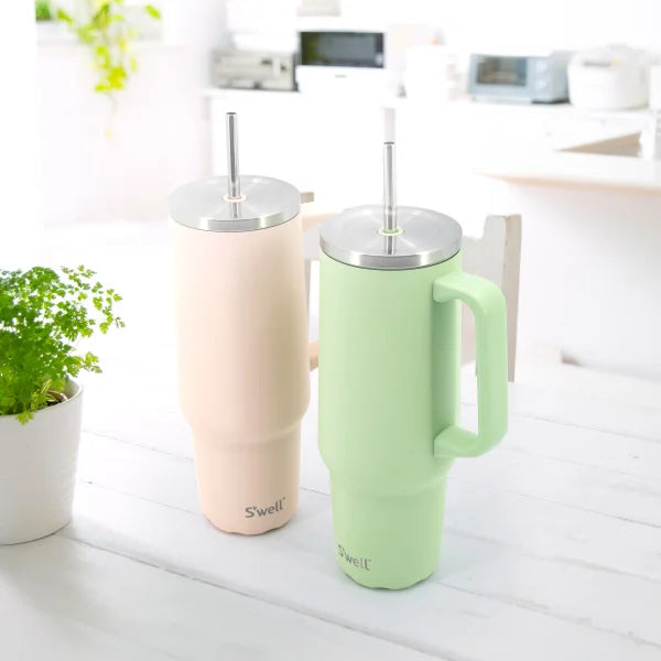 S'well's set of 2, 1.2 L (40 oz) Explorer tumblers, in the colours of  pistachio and himalayan salt, boast handles for easy grip. Crafted from 91% recycled stainless steel. BPA and BPS-free, these reusable tumblers are recommended for handwashing to maintain their vacuum-insulated efficiency.