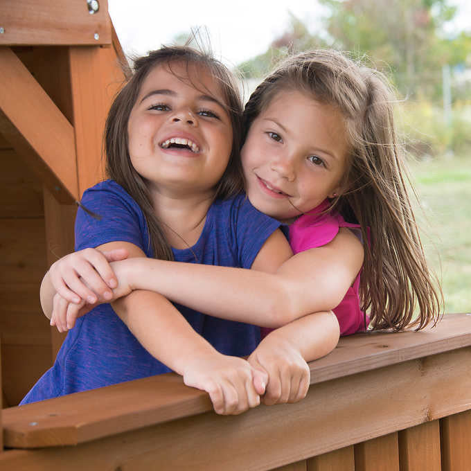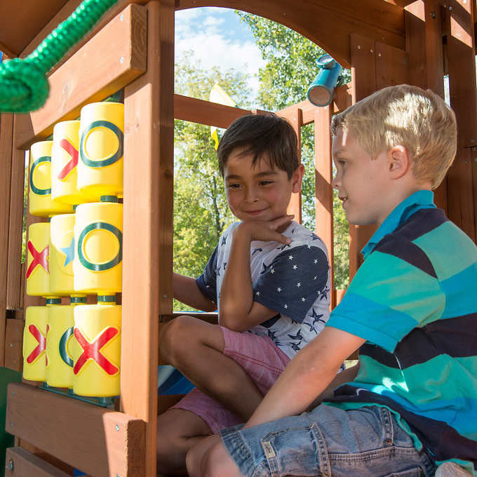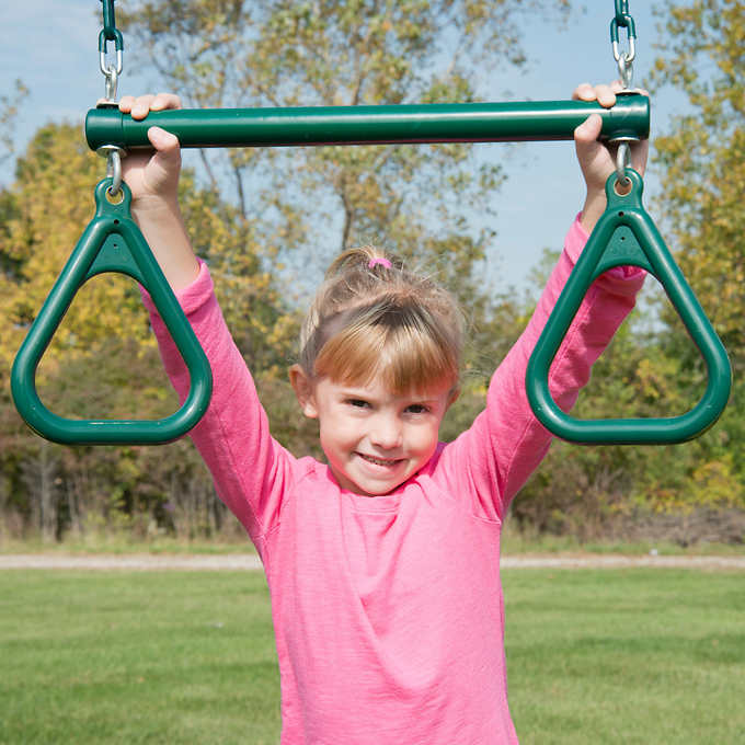 • Belt swings: (2) heavy-duty, 1-piece molded swing seats with reinforced nylon grommets and UV protection to resist fading. Matching coated 'pinch-free' chains that stay cool to the touch and won't fray or rust. Premium swing hangers with safety clips for adjustability